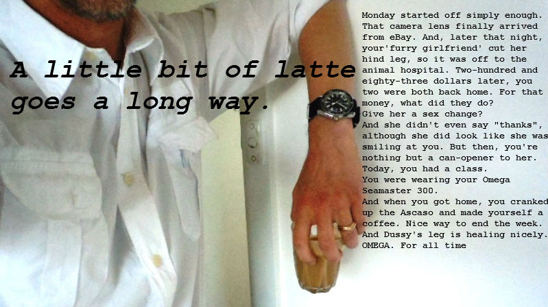 So anyway, the fella on the watch forum needed the opinions of his peers. And then I had an idea. But I didn't have a Submarine. Oh no. I had the next best thing. I had a coffee machine. I also had a white shirt and a collection of Omega Speedmaster badges.