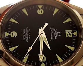 If I have a gripe about anything, it's the crystal. The watch has a sapphire crystal. It's nicely convex with a very finely bevelled edge. I just wish that Omega had given it an anti-reflective coating. While the dial itself is supremely legible, the crystal does reflect light that's bounced against it. An A/R coating would have made the watch look as if it had no crystal, thus making the entire dial stand out even more. My watchmaker friend tells me there's a mob interstate who can put an anti-reflective coating on this crystal, but I think I'll just leave it be.