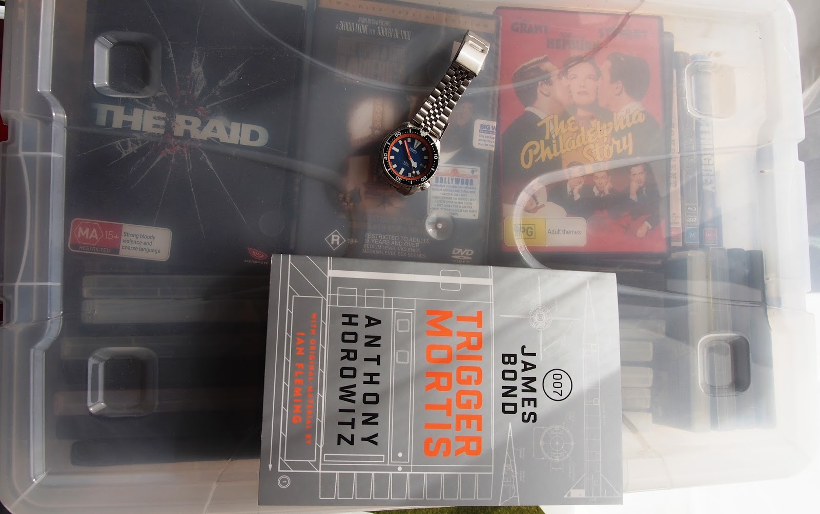 Continued with the odd jobs. I switched back to the Seiko.There are two or three tubs filled with DVDs, but I don't have the shelf space to put them on display just yet. I snagged a paperback copy of Trigger Mortis, even though I have already read 165 pages of it on my Kindle app. I still prefer the feel and look of a paper book. Call me old fashioned.